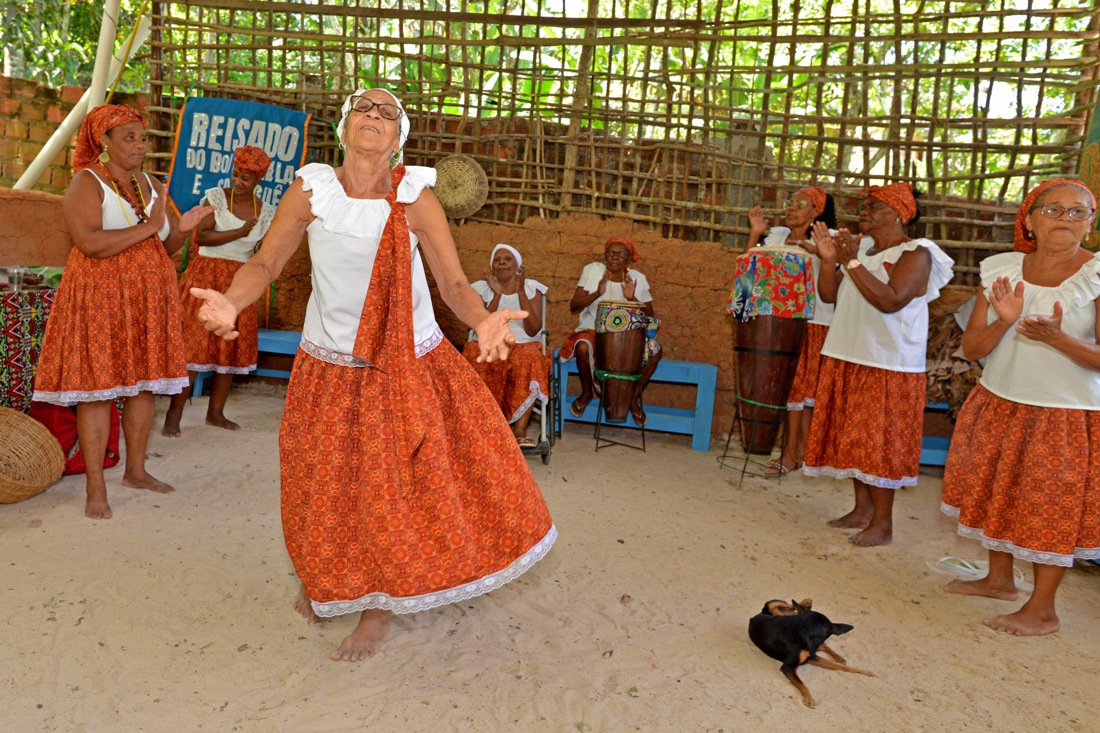 Ao ouvir uma sugestão para posicionar o rosto de uma determinada forma no momento de ser fotografada, Dona Detinha, 85 anos, emite um sorriso debochado e responde com um curto “ah, tá”, como quem duvida de que uma determinada posição vai realçar a sua beleza na imagem. Sentada em uma cadeira de rodas há mais de um ano, depois que as pernas perderam definitivamente a força para mantê-la em pé, a anciã segue com uma atitude positiva frente à vida e exibe um contagiante vigor enquanto canta e toca o atabaque para que suas amigas do grupo Beijuzeiras de Areia Branca sambem no barracão do ponto de cultura e memória Aldeia Casa da Fonte, em Lauro de Freitas.
