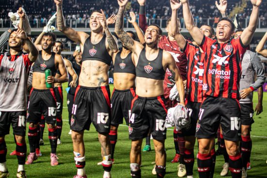 Jogadores do Vitória comemoram resultado histórico diante do Santos na Vila Belmiro - Foto: Victor Ferreira | EC VitóriaPassadas 10 rodadas do returno, o Vitória vive seu melhor momento no…