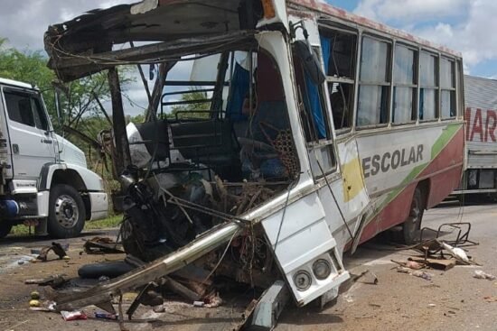 O ônibus ficou com a frente completamente destruída - Foto: Reprodução | Redes SociaisUma batida entre um ônibus escolar e uma carreta deixou, pelo menos, três pessoas mortas na manhã…