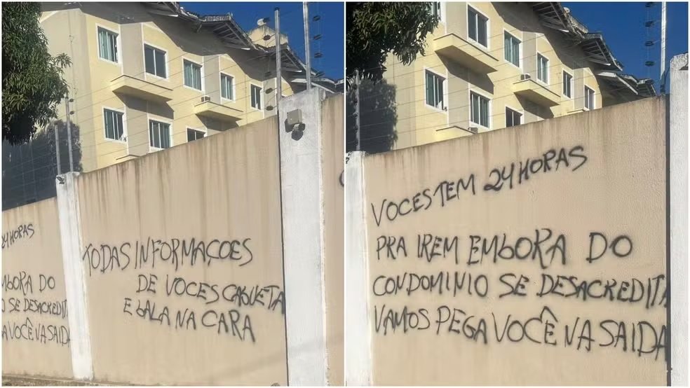 As mensagens, escritas nos muros do condomínio, trazem frases como: “Vocês têm 24 horas para irem embora do condomínio, se desacreditar, vamos pegar você na saída”. Além disso, placas de veículos de, pelo menos, três moradores foram expostas, indicando alvos específicos dentro da comunidade.