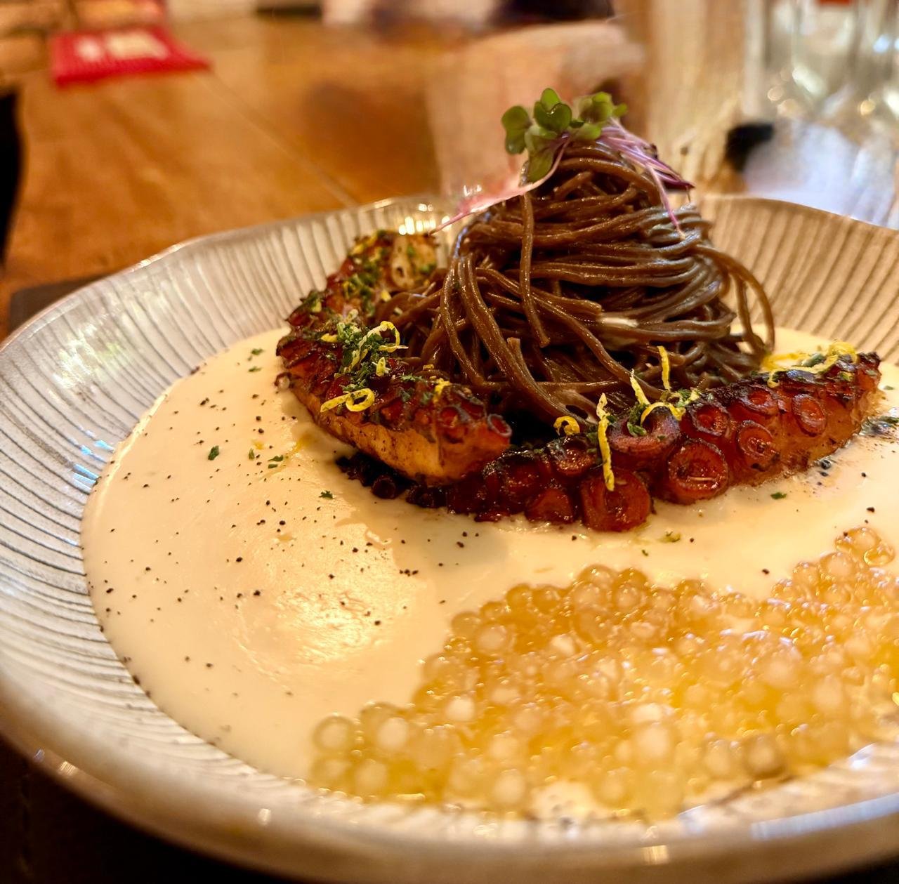O destaque do restaurante é o prato “Do Mar ao Cacau”, um spaghetti artesanal de cacau 100% com fonduta de parmesão, manteiga de cacau, polvo aromático e caviar de mel de cacau, assinado pelas chefs Léa Baptiston e Léia Tavares, disponível por R$ 89.