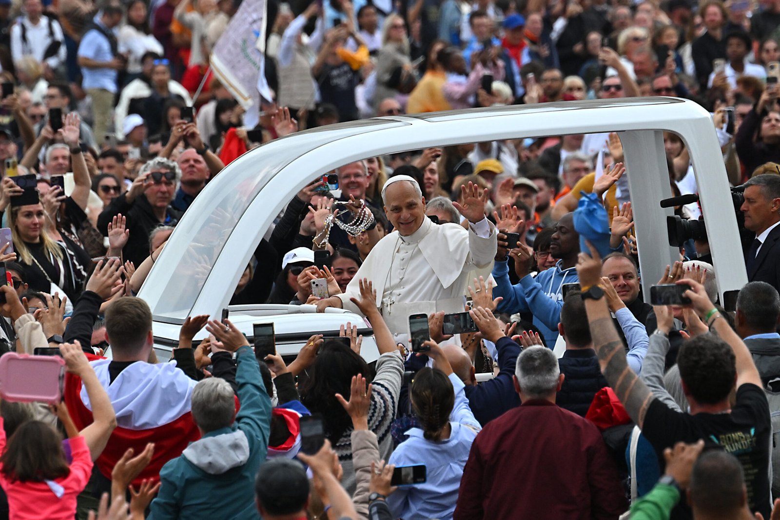 Papa Leão XIV (C) acena para os fiéis do papamóvel ao deixar a Praça de São Pedro –